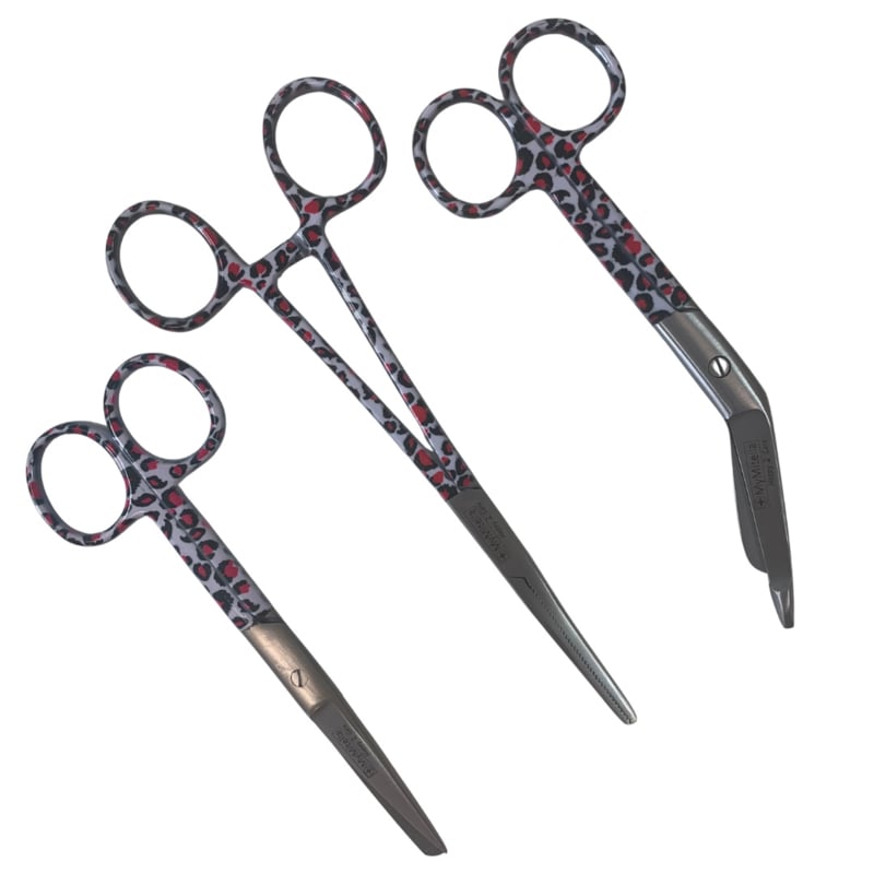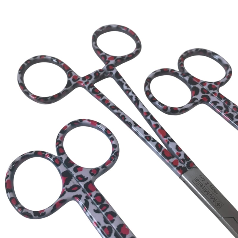 Een scharenset speciaal ontwikkeld is voor verpleegkundigen, medewerkers in de zorg en medici die kiezen voor sterk en praktisch met een hippe dierenprint. Deze panterprint staat superleuk bij jouw witte zorgoutfit. Een eenmalige set met een verpleegkundige schaar, een verbandschaar en en een kocher.