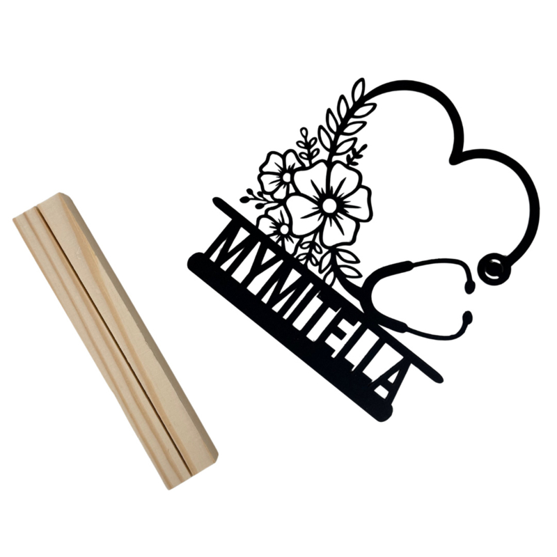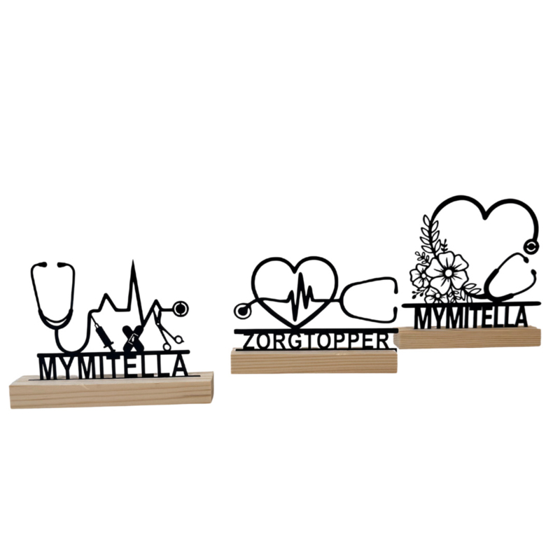Een superleuke decoratie voor op het bureau of als woonaccessoire in een houten standaard - Een stijlvolle accessoire voor iedere zorgprofessional. Dit ornamentje van zwart metaal kan worden voorzien van een tekst, naam of bedrijfsnaam. Een persoonlijk cadeau voor iedere zorgkanjer!