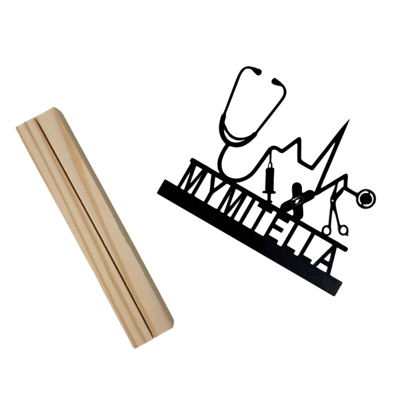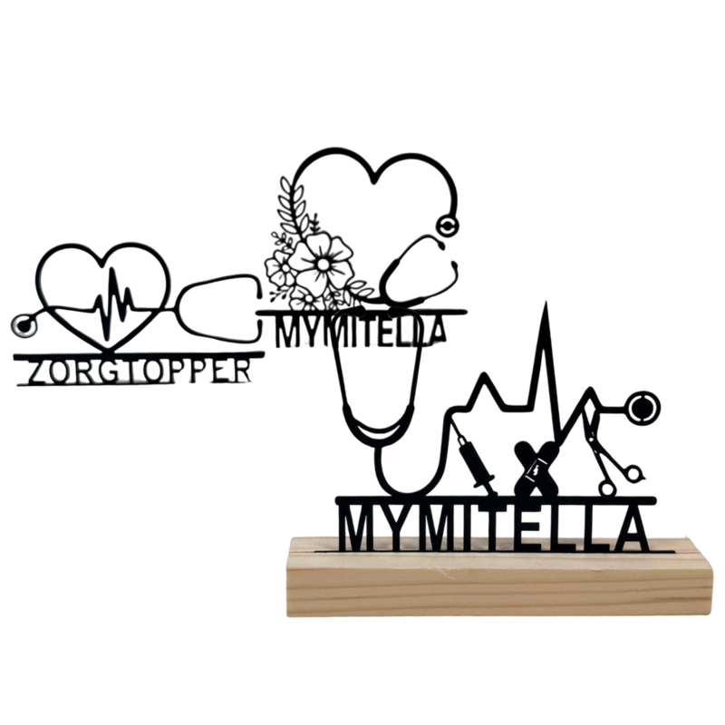 Een superleuke decoratie voor op het bureau of als woonaccessoire in een houten standaard - Een stijlvolle accessoire voor iedere zorgprofessional. Dit ornamentje van zwart metaal kan worden voorzien van een tekst, naam of bedrijfsnaam. Een persoonlijk cadeau voor iedere zorgkanjer!