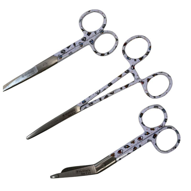 De functionele set bestaat uit een verbandschaar, een kocher en een verpleegkundige schaar. De sterke coating die is aangebracht op het staal heeft vrolijke prints en fleuren jouw dag & die van de patiënt/cliënt.