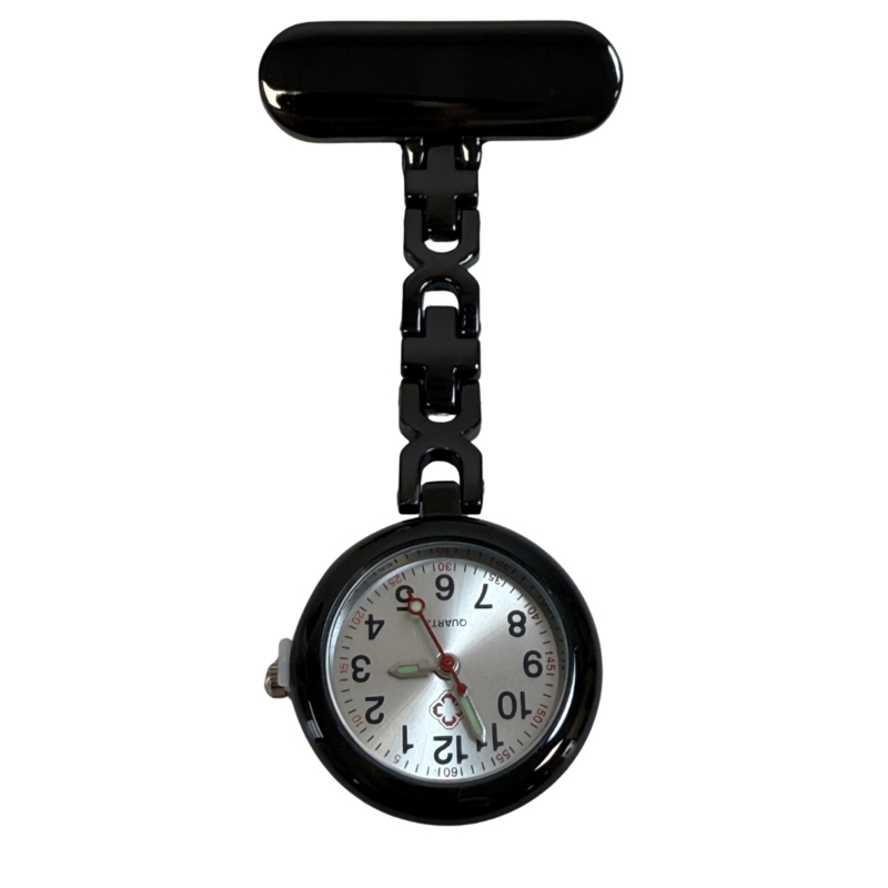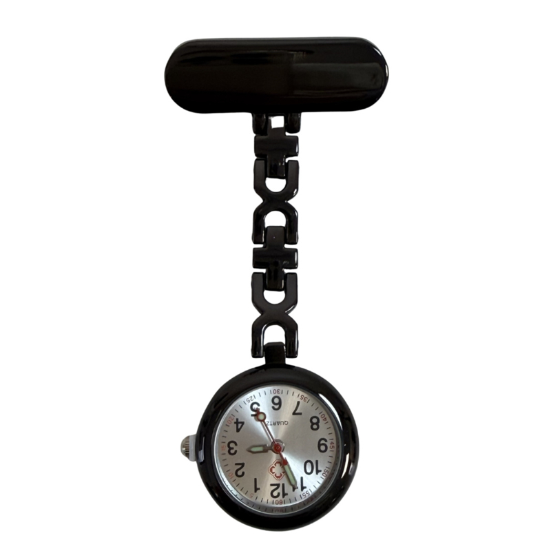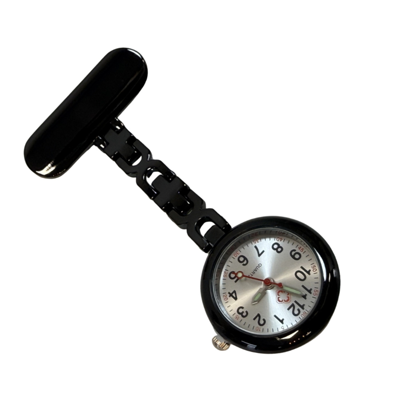 Door de metalen speld aan de achterkant is het klokje eenvoudig te bevestigen aan kleding, je uniform of doktersjas. Het uurwerk hangt ondersteboven zodat je van bovenaf kunt zien hoe laat het is.