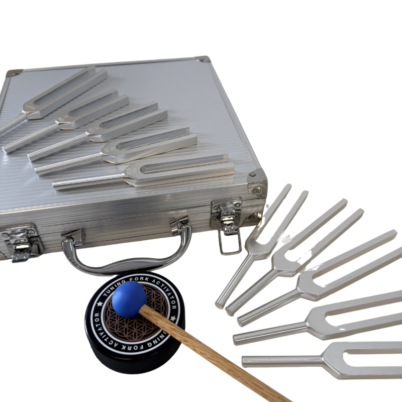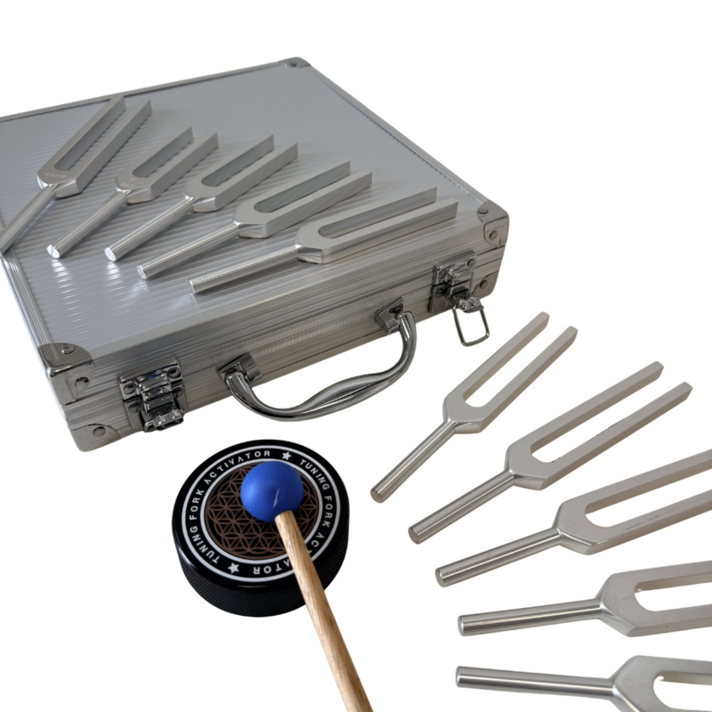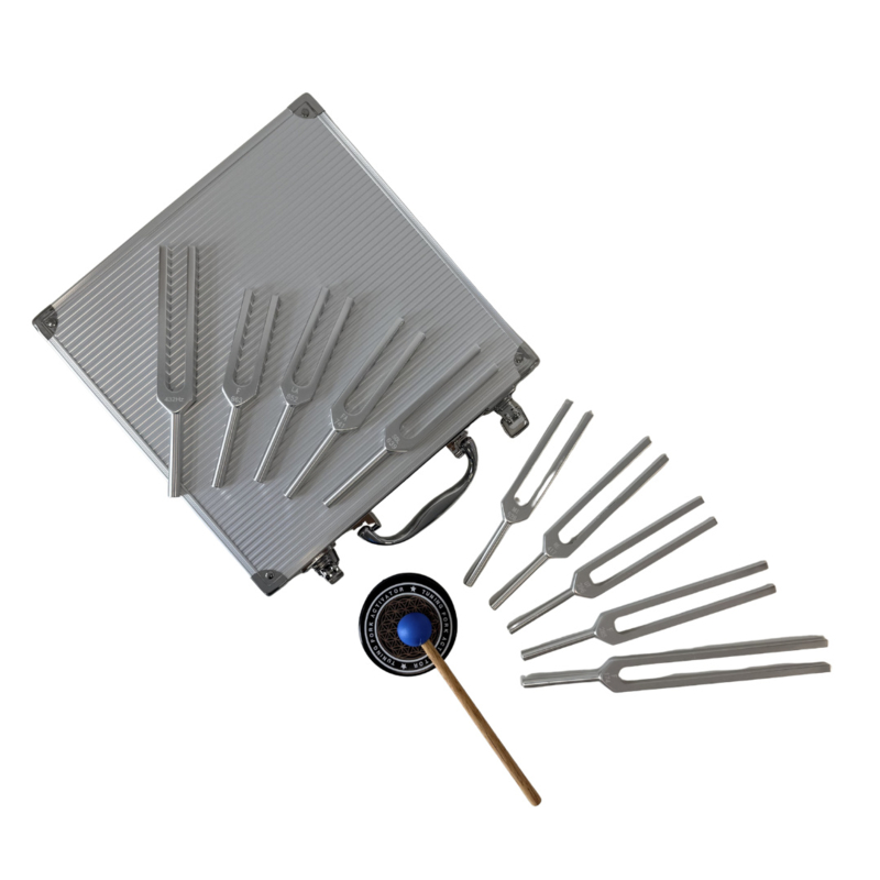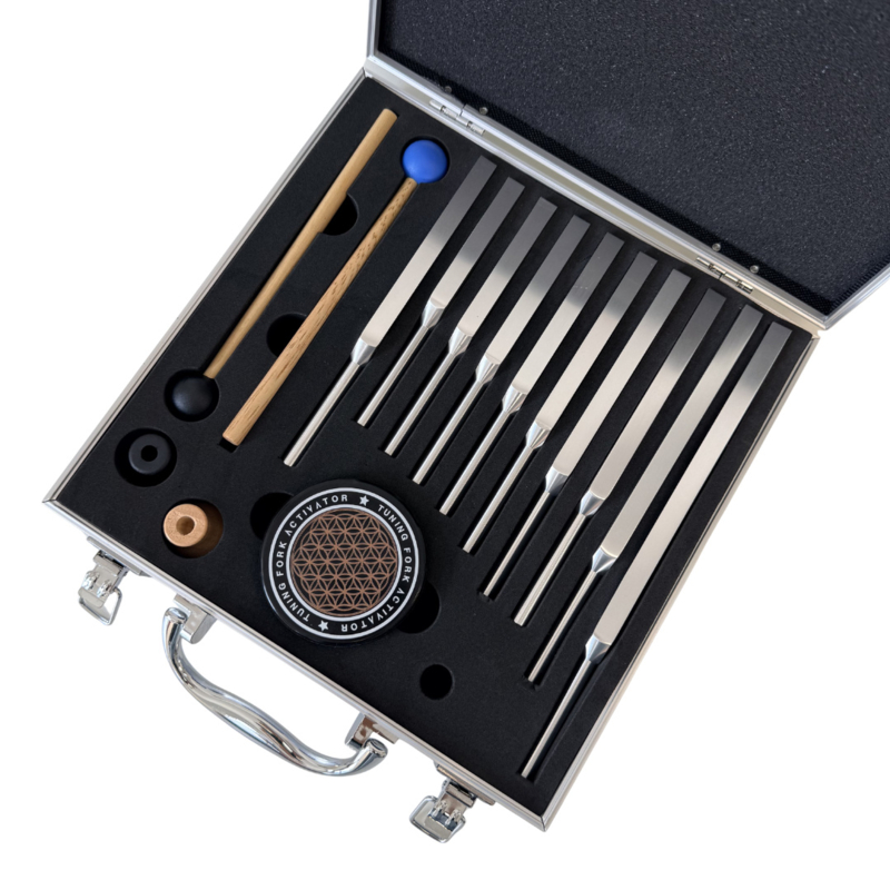 Metalen koffertje met 10 verschillende medische stemvorken een activatie blok en 2 slaghamertjes. Medische tools voor diagnostisch onderzoek of fonoforese maar ook therapeutisch gebruik. De medische stemvorken zijn bij MyMitella in verschillede versies, samenstellingen te verkrijgen ook als losse stemvorken (met of zonder gefixeerde dempers) in verschillende frequenties.