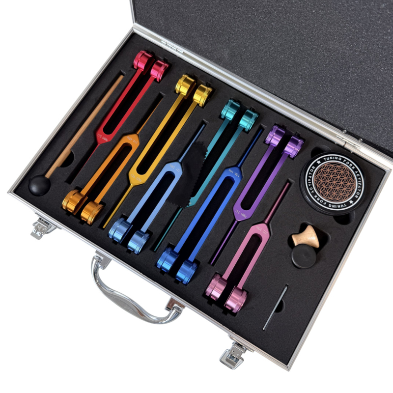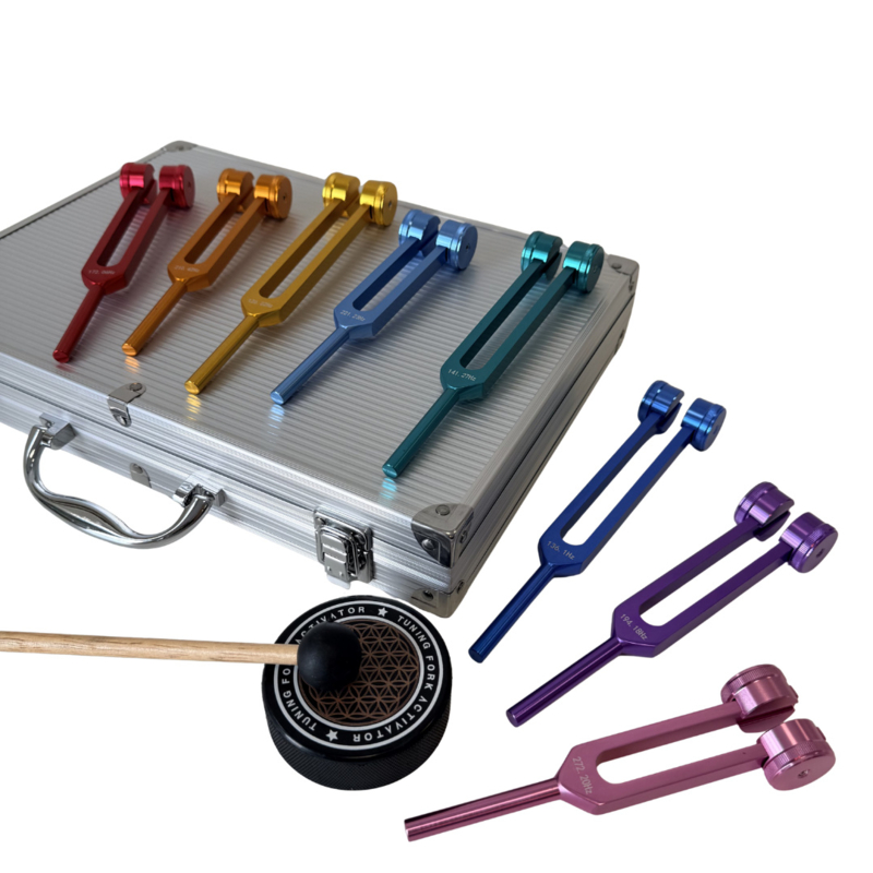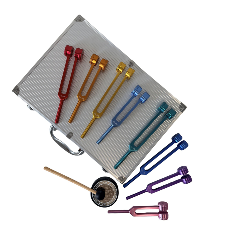 Metalen koffertje met 8 verschillende medische stemvorken een activatie blok en 1 slaghamertje. Medische tools voor diagnostisch onderzoek of fonoforese maar ook therapeutisch gebruik. De medische stemvorken zijn bij MyMitella in verschillede versies, samenstellingen te verkrijgen ook als losse stemvorken (met of zonder gefixeerde dempers) in verschillende frequenties.