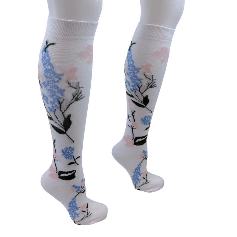 Artikelnummer: CK-033Compressiekousen werken steungevend en tegen vermoeidheid- Een compressiekous wit met kleurrijke details