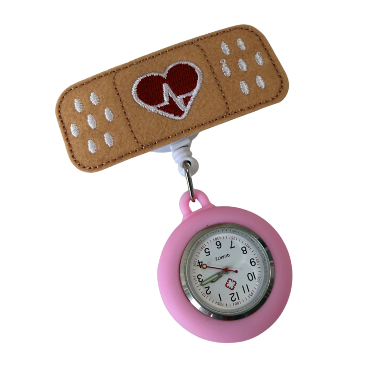 De pleister van textiel op dit zorghorloge is een echte eyecatcher voor patiënten en cliënten. Hij sluit aan de achterkant met een clip waardoor je deze over het zakje van je zorgjasje kan schuiven. Een horloge met secondewijzer voor de zorgprofessional die voor een lach zorgt.