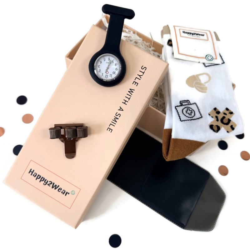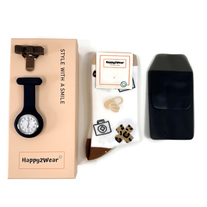 Style with a smile - Geschenkset voor zorgpersoneel met Happy2Wear sokken - een pennenclip & zakbeschermer en een zorghorloge.