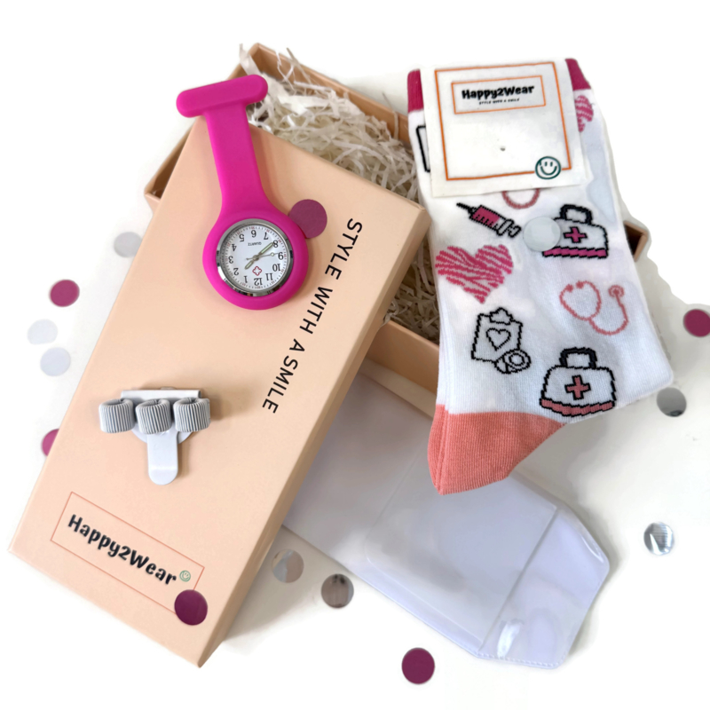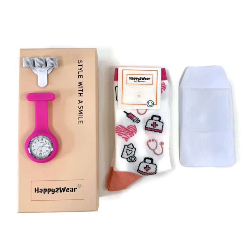Style with a smile - Geschenkset voor zorgpersoneel met Happy2Wear sokken - een pennenclip & zakbeschermer en een zorghorloge.