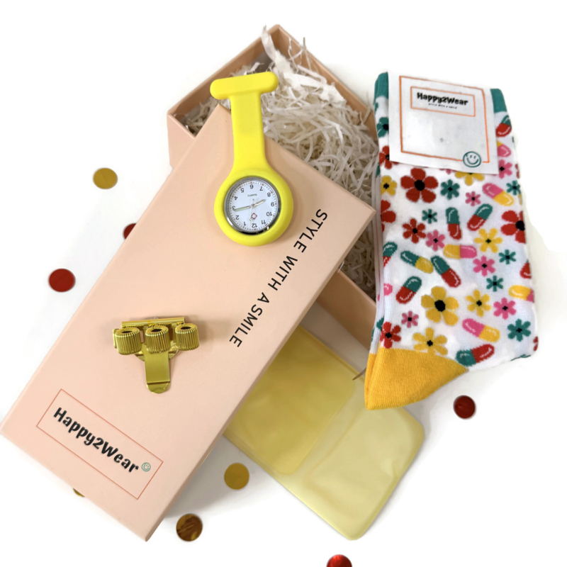 Een luxe cadeauverpakking om een zorgprofessional eens flink in het zonnetje te zetten. Na het behalen van een diploma, als dank voor liefdevolle zorg of om iemand een hart onder de riem te steken. Maak van hem of haar met dit geschenk een zorgheld op sokken. Deze Style with a Smile geschenkdoos is gevuld met de geliefde Happy2Wear sokken in vrolijke kleuren en bijpassende verpleegkundige tools. Een zorghorloge, een pennenclip en een handig hoesje om je zak te beschermen tegen (pen)vlekken. Met dit complete set maak je je persoonlijke verpleegkundige outfit uniek!