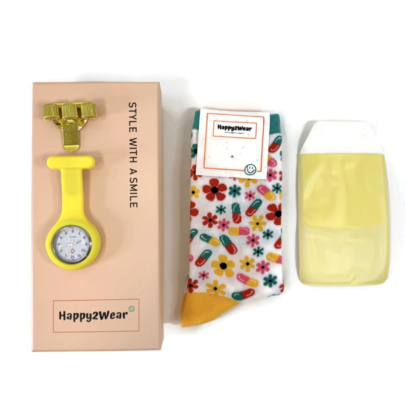 Artikelnummer: CDS-007Style with a smile - Geschenkset voor zorgpersoneel met Happy2Wear sokken - een pennenclip & zakbeschermer en een zorghorloge.