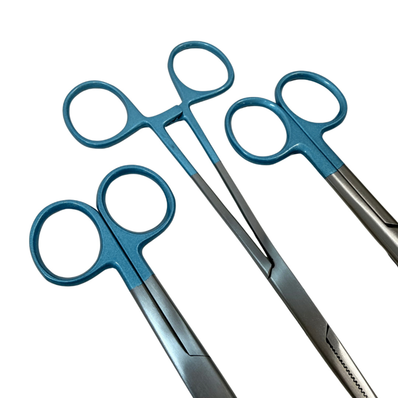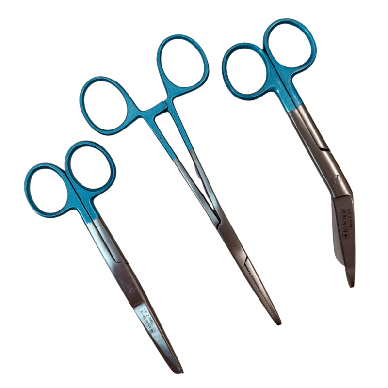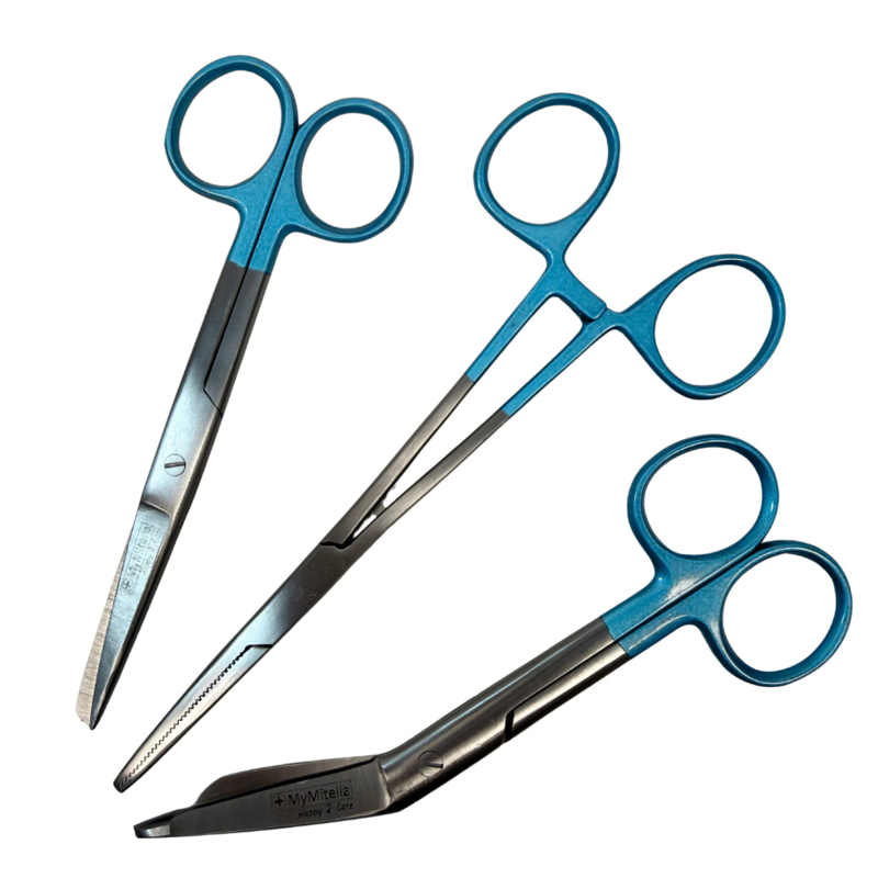 Set bestaat uit: Kocher, verbandschaar en verpleegkundige schaar.