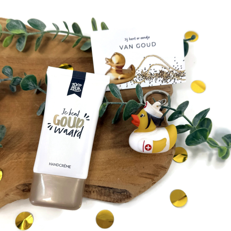 Wie een zorgmedewerker wil bedanken voor de goede zorgen, liefdevolle inzet of voor de fijne begeleiding vindt in dit setje een tof cadeau. Een mooi compliment is eenvoudig te geven maar is van grote waarde. Idereen vindt het fijn om een beetje extra waardering te ontvangen: Wat als je dat kan doen met de mooie tekst: Jij bent er Eendje van goud!